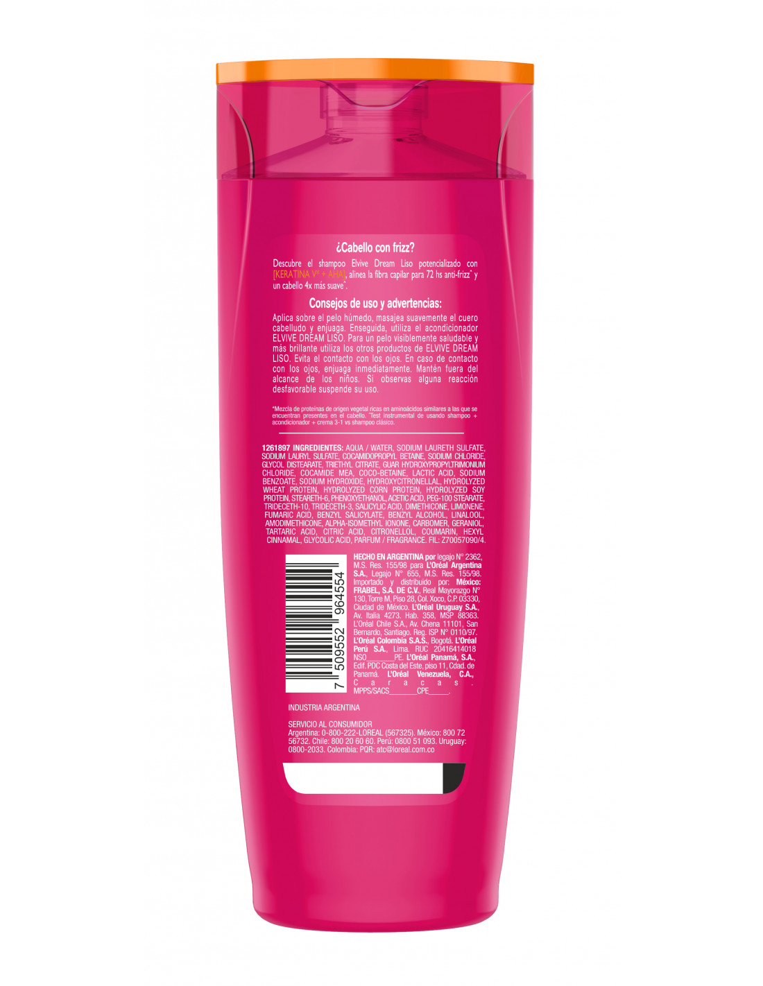 Aplicar Sobre El Pelo Húmedo, Masajear Suavemente El Cuero Cabelludo Y Enjuagar. Enseguida, Utiliza El Acondicionador Elvive Dream Liso. Para Un Pelo Visiblemente Saludable Y Más Brillante Utiliza Los Otros Productos De Elvive Dream Liso. Evite El Contacto Con Los Ojos. En Caso De Que Esto Ocurra, Enjuague Inmediatamente. Mantenga Fuera Del Alcance De Los Niños. Si Observa Alguna Reacción Desfavorable, Suspenda El Uso.Hipoalergenico:
