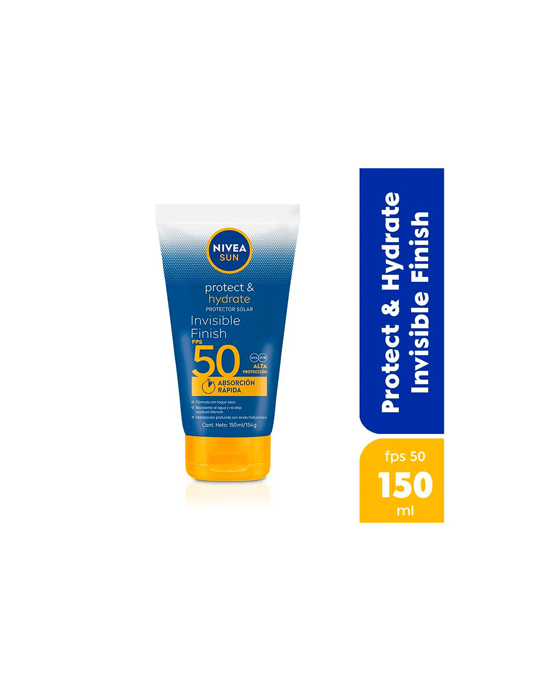 El protector solar NIVEA SUN Protect & Hydrate Invisible Finish FPS 50 ofrece una fórmula de rápida absorción, con Ácido Hialurónico para una hidratación profunda y duradera.