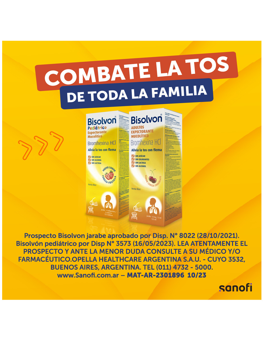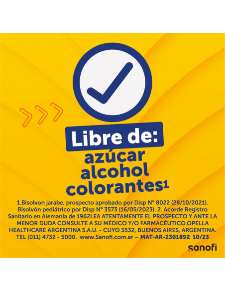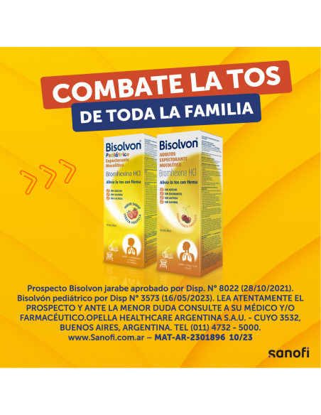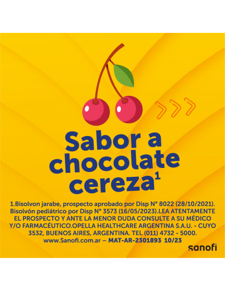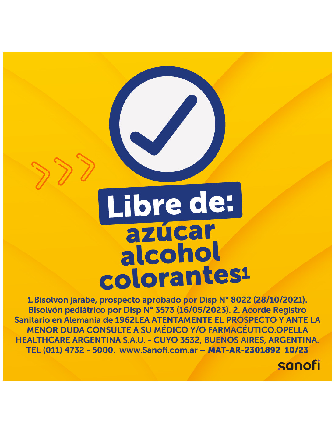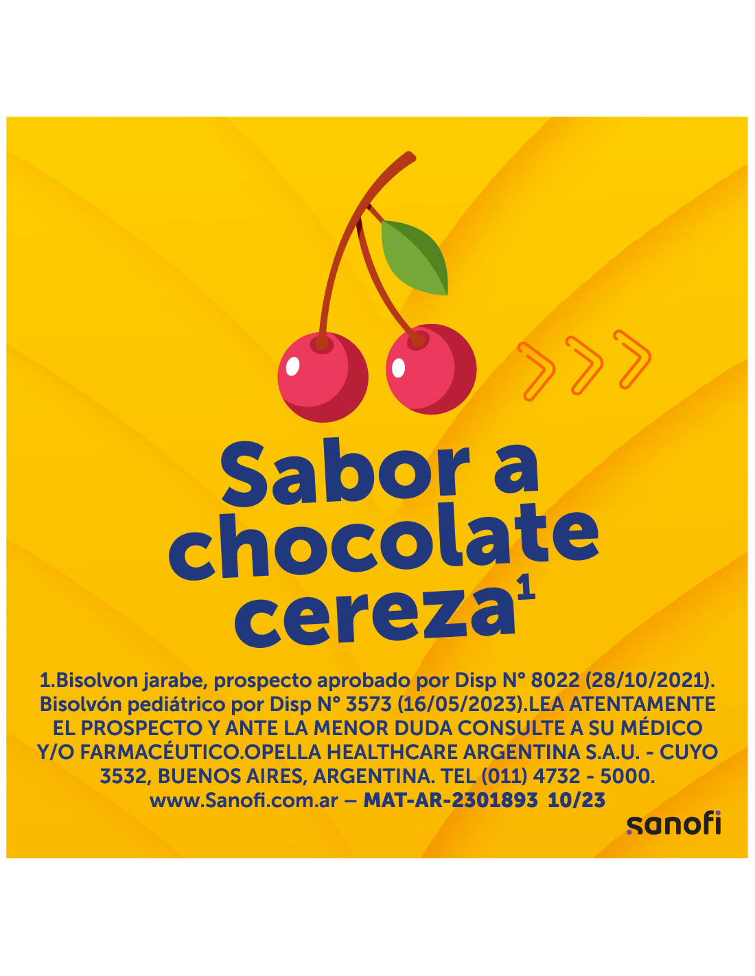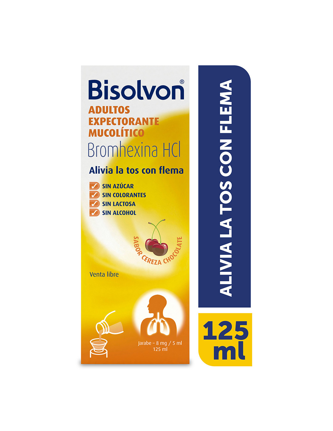 Bisolvon jarabe contra la tos con flema, contiene el ingrediente activo Clorhidrato de Bromhexina, Maltitol líquido, sucralosa, ácido benzoico, aroma de cereza, aroma de chocolate, mentol y agua purificada.