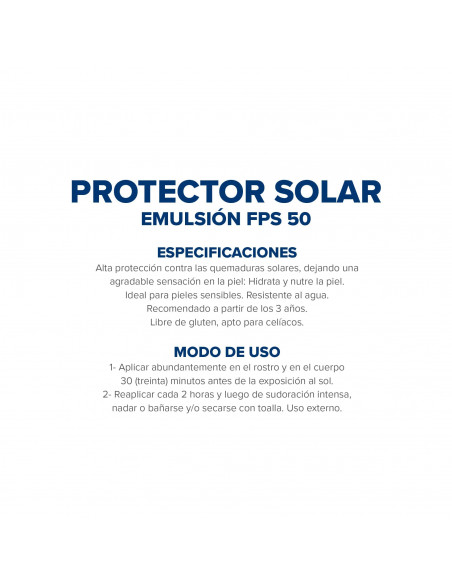 Modo de uso: Aplicar abundantemente en el rostro y en el cuerpo 30 (treinta) minutos antes de la exposición al sol. Reaplicar cada 2 horas y luego de sudoración intensa, nadar o bañarse y/o secarse con toalla. Uso externo.