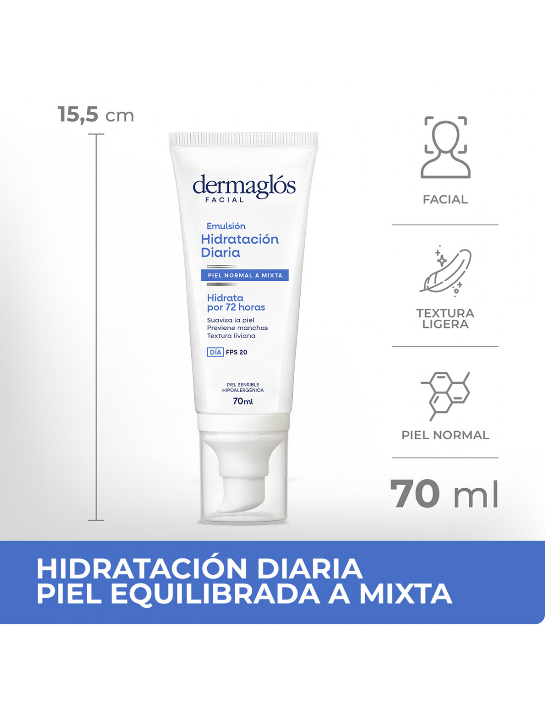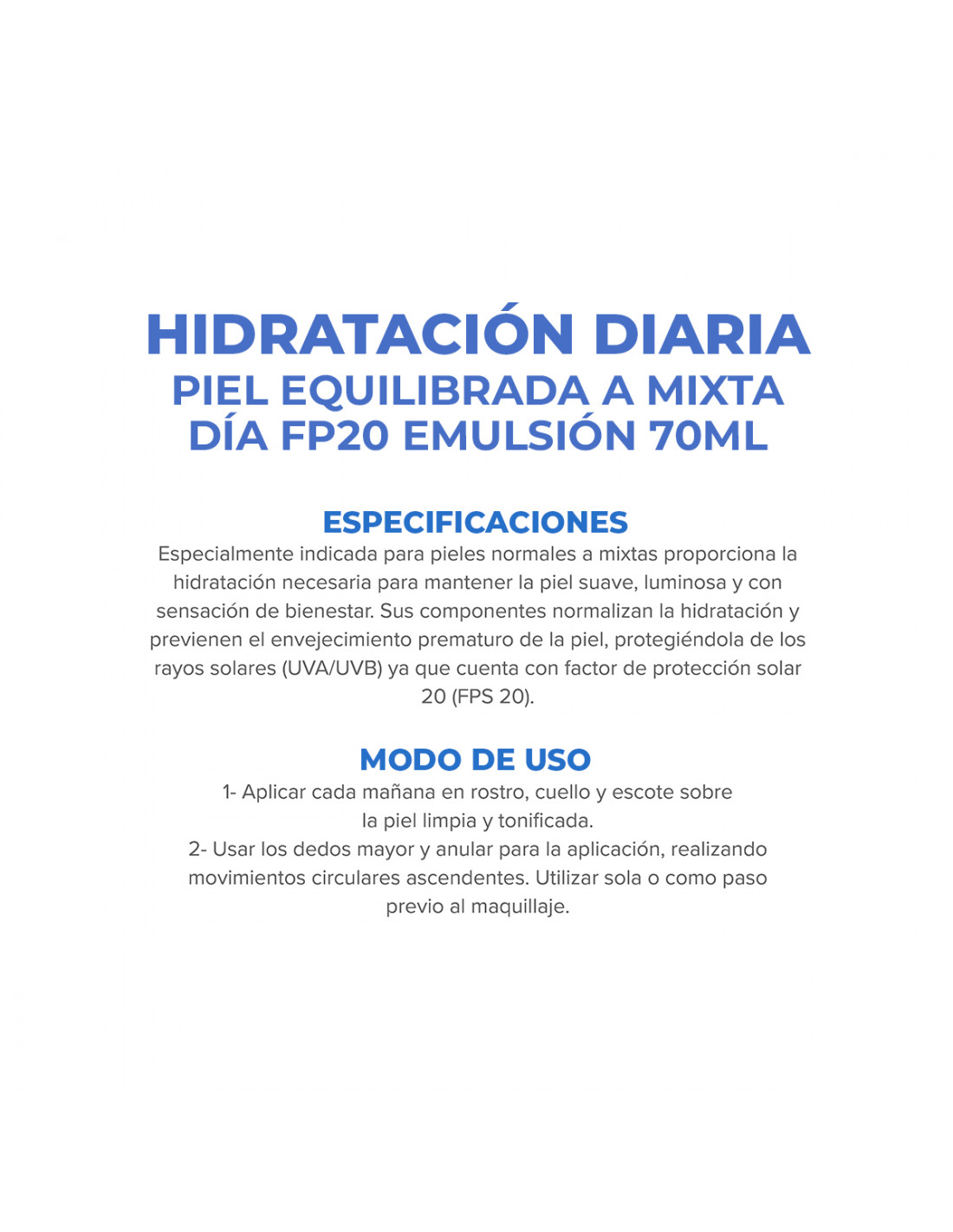 Modo de uso: Aplicar cada mañana en rostro, cuello y escote sobre la piel limpia y tonificada. Usar los dedos mayor y anular para la aplicación, realizando movimientos circulares ascendentes. Utilizar sola o como paso previo al maquillaje. Presentación: Emulsión en pomo con bomba x 70 ml Composición: Vitamina A; Normaliza la piel seca y deshidratada. Vitamina E; Previene el envejecimiento prematuro de la piel. Pentavitim ™*; Regula la humectación bajo condiciones secas, donde otros humectantes pierden efectividad. FPS 20; Protege la piel contra los daños producidos por los rayos UVA y UVB. * Pentavitim ™ es una marca registrada de DMS.