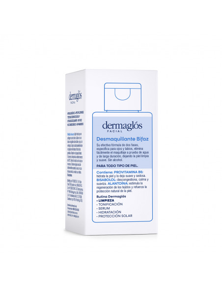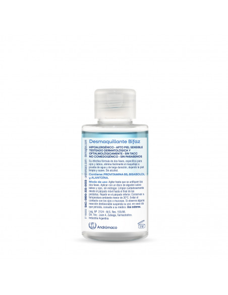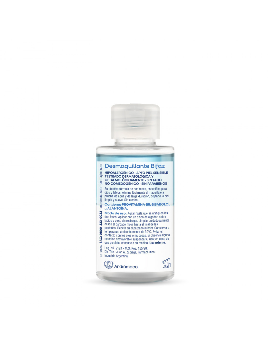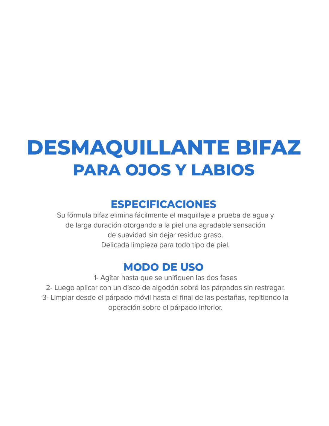 Modo de uso: Agitar hasta que se unifiquen las dos fases, luego aplicar con un disco de algodón sobré los párpados sin restregar. Limpiar desde el párpado móvil hasta el final de las pestañas, repitiendo la operación sobre el párpado inferior. Presentación: Loción x 120 ml Composición: Fórmula de dos fases que remueve rápidamente el maquillaje. Provitamina B5; Hidrata la piel dejándola suave y sedosa. Bisabolol; Descongestiona, calma y suaviza. Alantoína; Regeneradora de la piel. Brinda sensación suave y tersa a la piel. Pantenol; Efecto no irritante, humectante y acondicionador.
