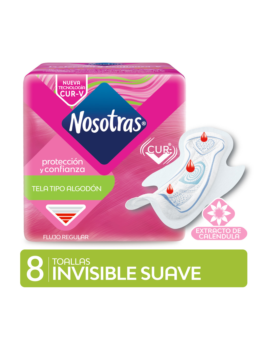Toalla Higiénica Nosotras Invisible tela tipo algodón x 8 unidades. Son más delgadas para mayor comodidad, pero absorben como una toalla más gruesita. Con Ajuste Seguro.