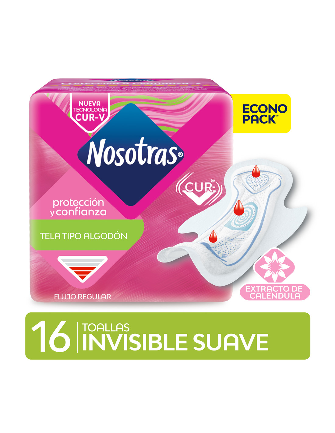 Toalla Higiénica Nosotras Invisible tela tipo algodón x 16 unidades. Son más delgadas para mayor comodidad, pero absorben como una toalla más gruesita. Con ajuste seguro.