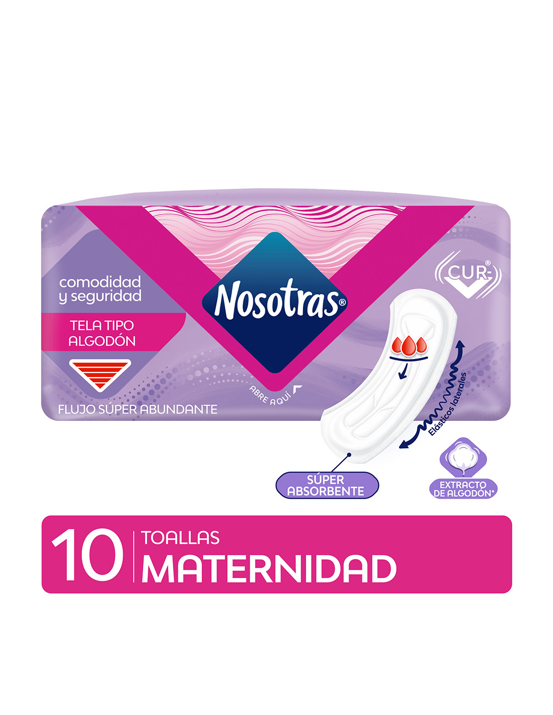 Toalla Higiénica Nosotras Maternidad x 10 unidades. Seguridad y comodidad para el intenso sangrado postparto, ideal para flujos muy abundantes que requieren máxima protección.