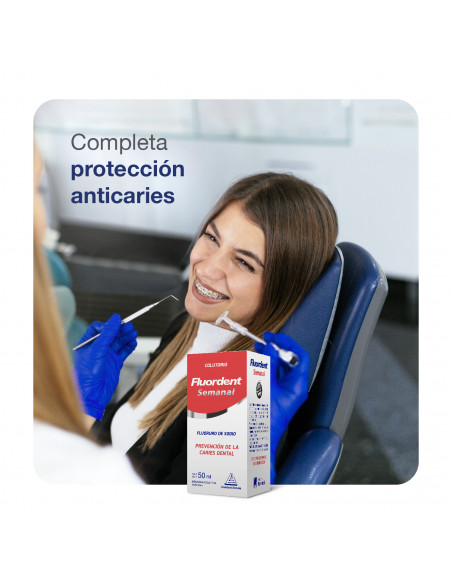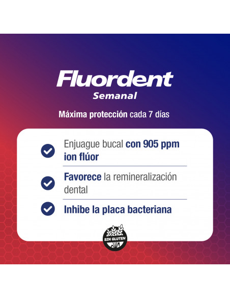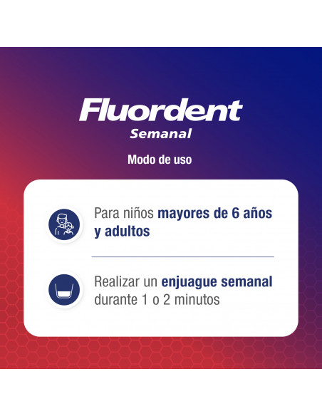 Fluordent Semanal protege contra la desmineralización y remineraliza el esmalte dental en caries incipientes o manchas blancas. También inhibe la formación de bacterias causantes de la producción de ácidos en boca.