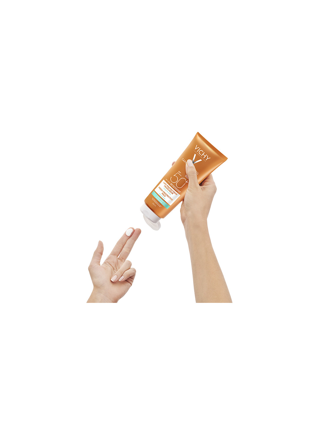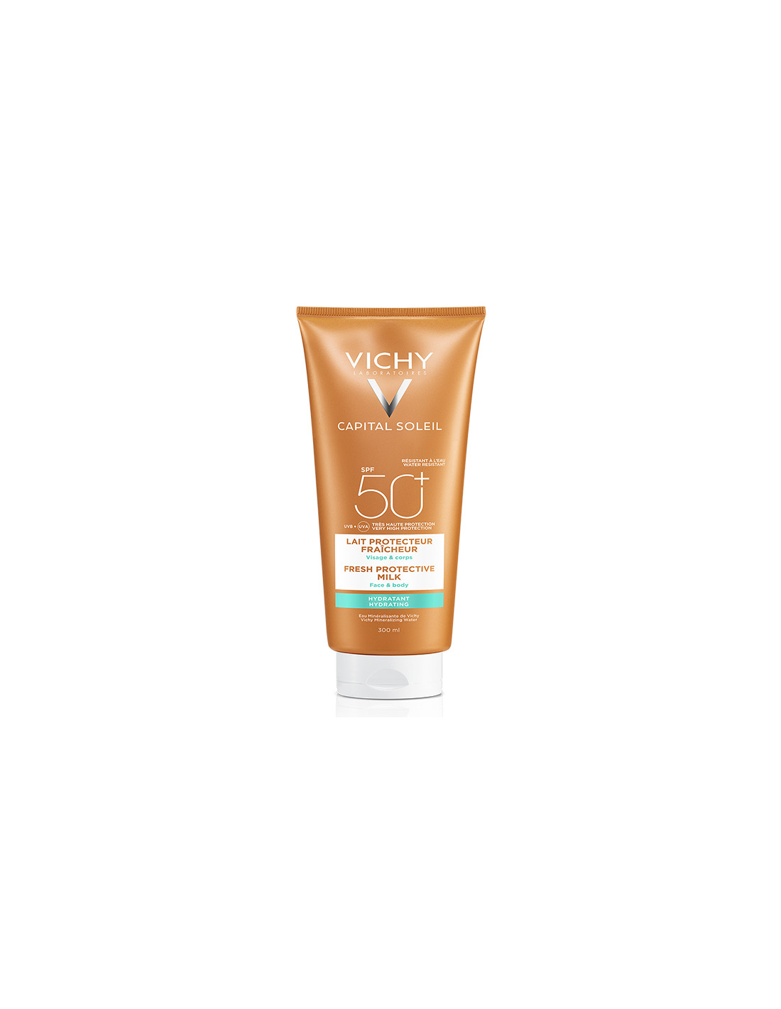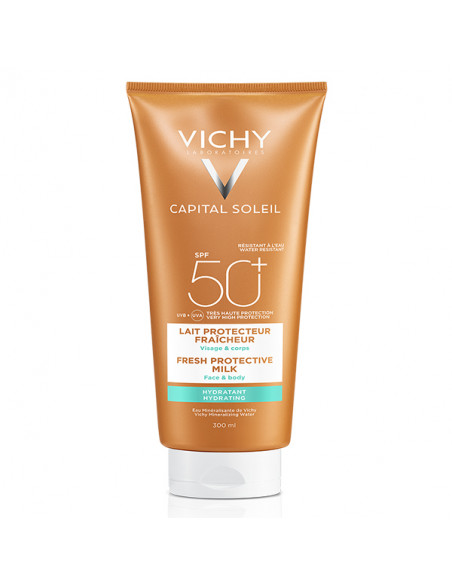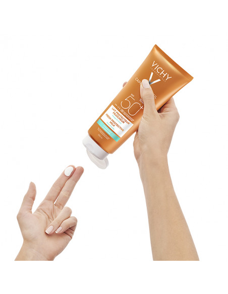 La leche hidratante FPS 50+, de gran formato con muy alta protección para las pieles sensibles de hombres y mujeres que buscan mayor protección solar. Se utiliza sobre el rostro y el cuerpo. Previene el envejecimiento cutáneo fotoinducido, las irregularidades pigmentarias, las manchas pigmentarias y las arrugas. Sin perfume ni parabenos. Hipoalergénica. Enriquecida con Agua Termal de Vichy, calmante, fortificante y regenerante. No deja sensación grasosa o apariencia blanquizca en la piel.