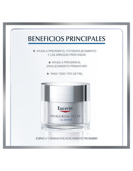 Eucerin HYALURON-FILLER Crema de Día es una fórmula anti-arrugas avanzada para todo tipo de piel. La fórmula combina Ácido Hialurónico de cadena molecular corta y larga para actuar donde se originan las arrugas mientras que la Saponina Bioactiva apoya la producción natural de Ácido Hialurónico de la piel. Con el uso regular, la piel luce suave y más joven. El FPS 30 y la protección UVA previenen efectivamente el envejecimiento prematuro y que las arrugas existentes se vuelvan más profundas.