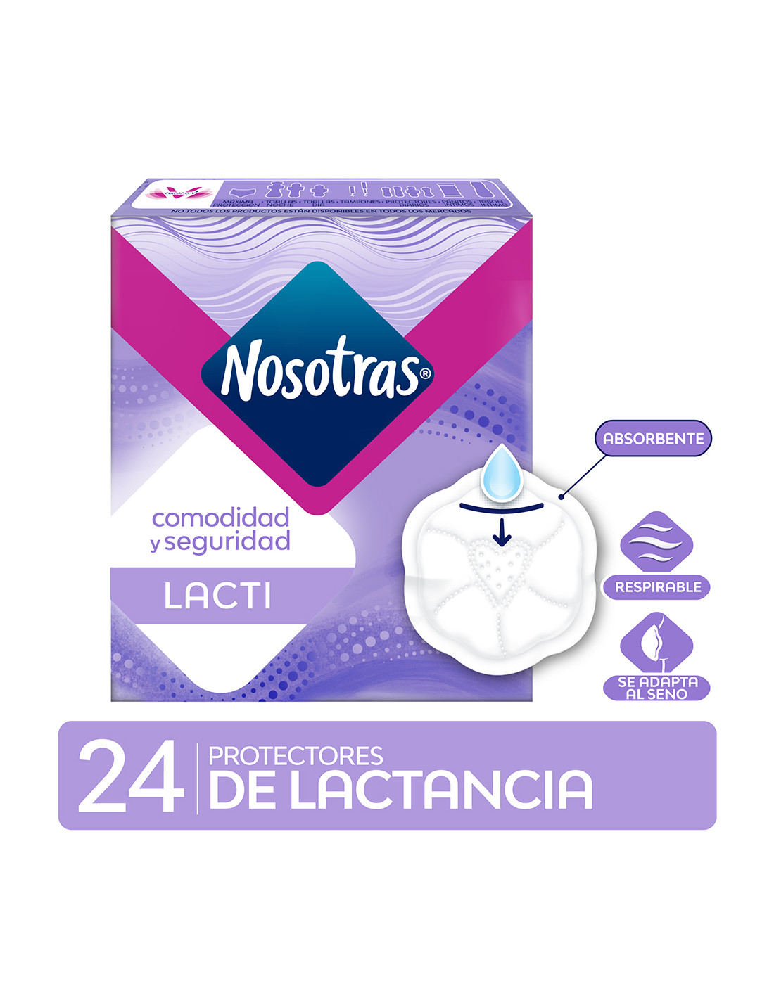 Protectores Nosotras de Lactancia x 24 unidades. 120 mm de diámetro, con autoadhesivo que garantizan una mejor fijación. Zona acolchada en el pezón con tela tipo algodón.