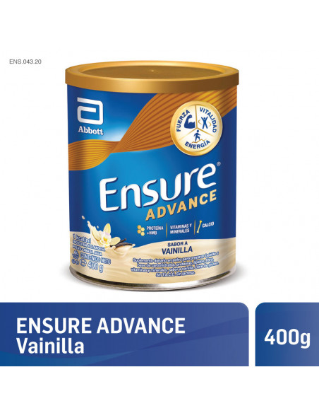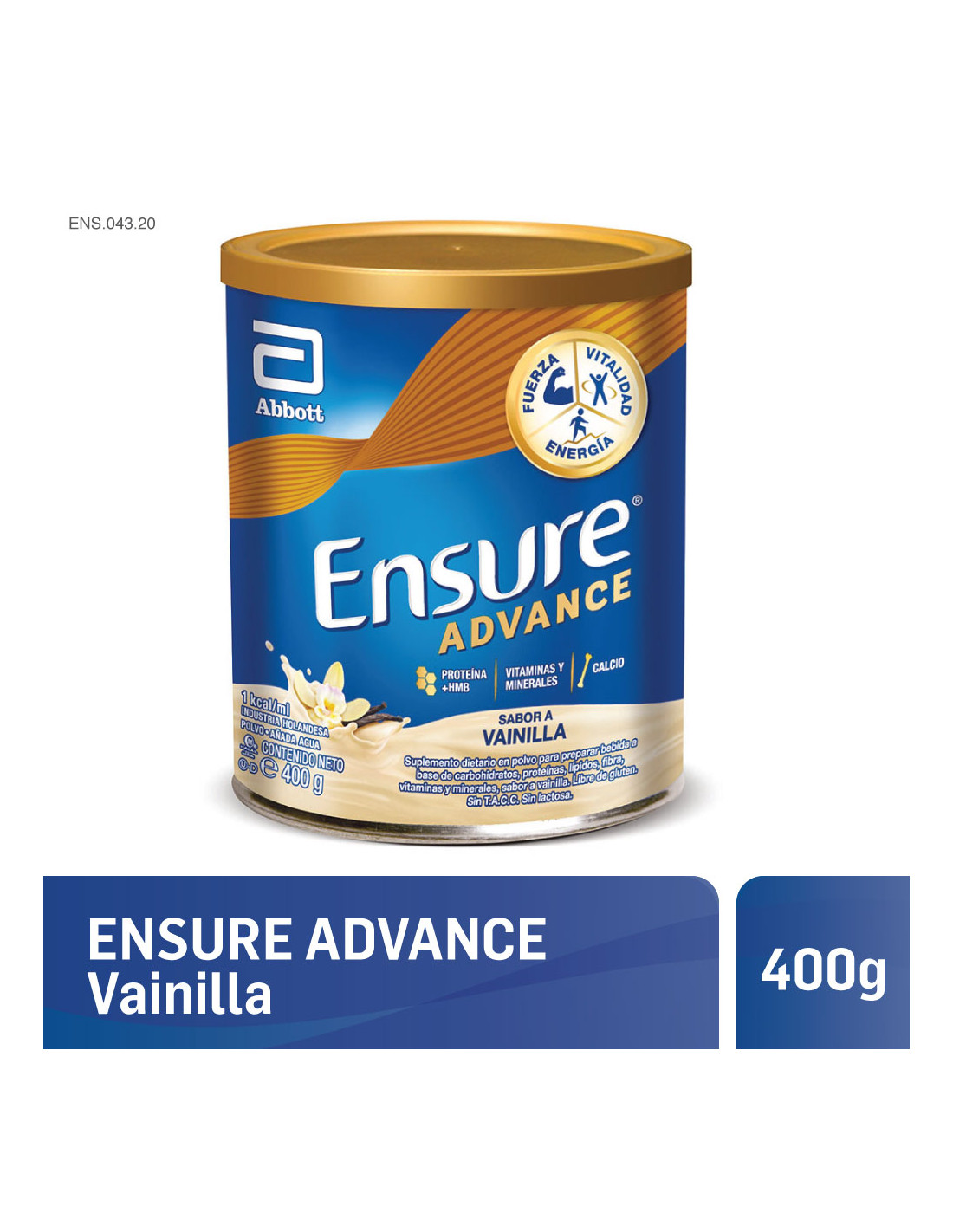 Ensure® advance está específicamente formulado para apoyar la fuerza, la vitalidad y la energía. Ensure® Advance, junto con ejercicios livianos, pueden ayudar a mejorar el estado físico. Un vaso de Ensure® Advance proporciona: 1.5 g de CaHMB, 8.6g de proteínas, especial para tus músculos, para que te sientas fuerte y 28 vitaminas y minerales, incluyendo calcio y vitamina D para la salud ósea. También contiene Omega 3 y 6 y no contiene grasas trans.