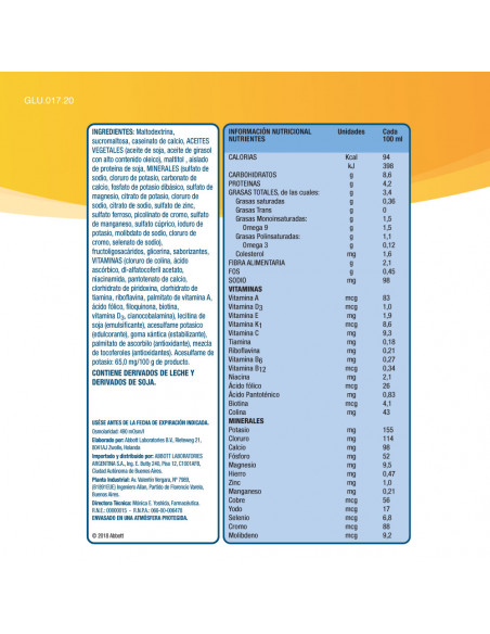 La fórmula de Glucerna® ha sido diseñada específicamente con un sistema avanzado de carbohidratos de absorción lenta para el manejo nutricional en las alteraciones del metabolismo de la glucosa, 28 vitaminas y minerales esenciales, proteínas, ácidos grasos Omega 9 y Omega 3 y además una combinación de ingredientes claves que incluyen fibra (FOS).